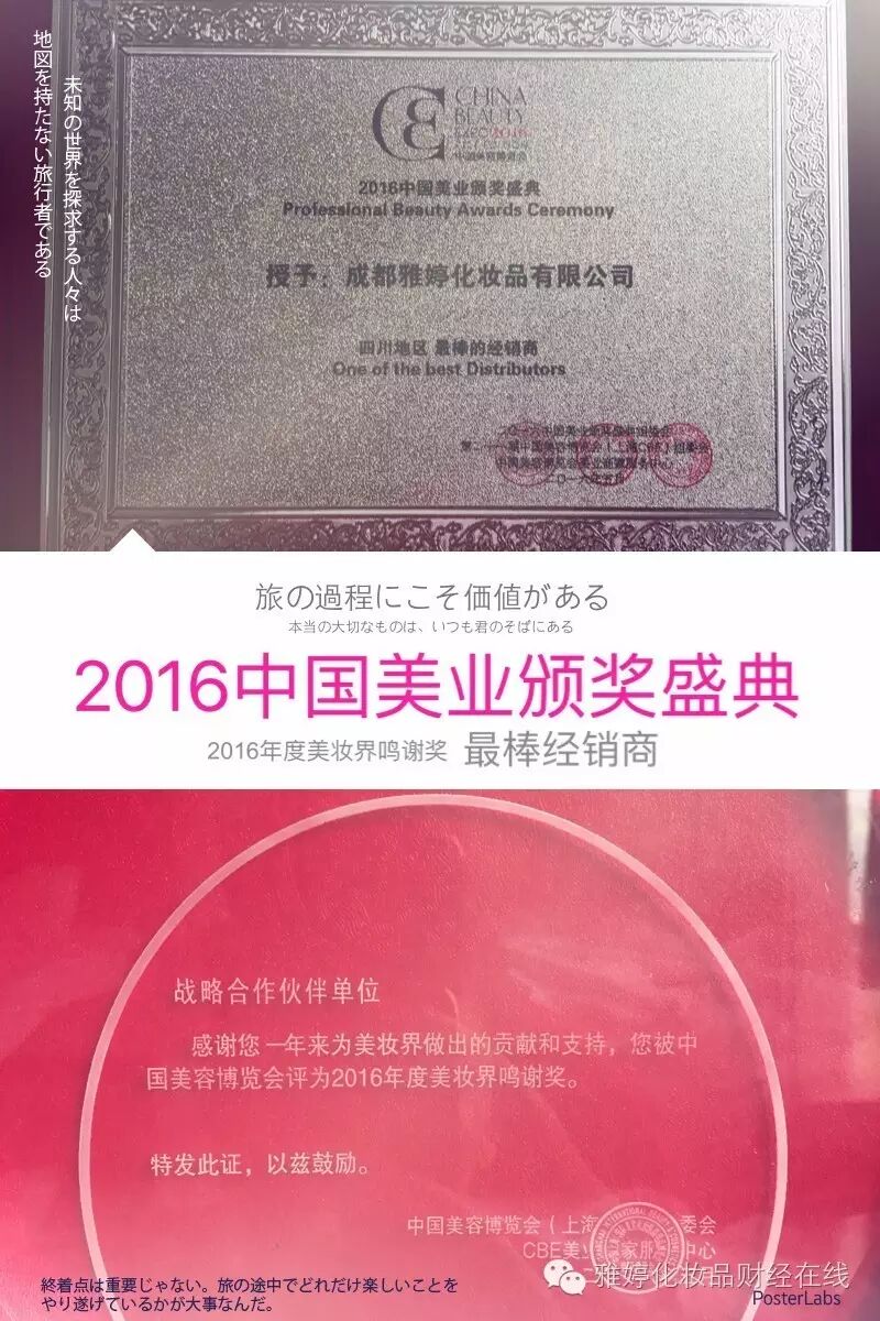 作为美协战略合作单位,为感谢一年来为中国美妆界做出的贡献和支持,雅婷集团被评为中国美容博览会——“2016年度美妆界鸣谢奖”、同时“成都雅婷化妆品有限公司“被授予“四川地区·最棒经销商”大奖!